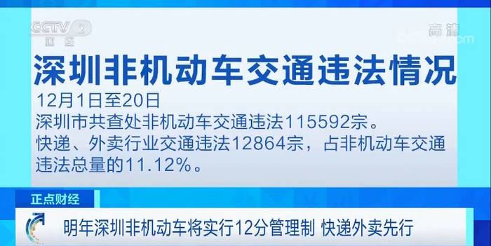 深圳交警数据显示,12月1日至20日,深圳市共查处非机动车交通违法115592宗,其中快递、外卖行业交通违法12864宗,占非机动车交通违法总量的11.12%。
