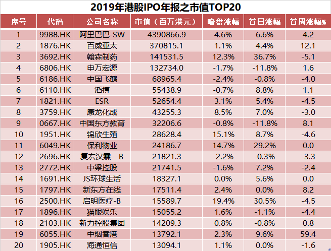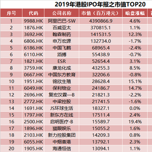 如果按照市值来排序,第二次赴港上市的中国互联网龙头企业阿里巴巴,将以近4.4万亿港元市值荣登2019年港股IPO市值榜榜首。