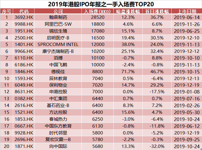 我们将2019年港股新股入场费做了一个排序,第一位的翰森制药以28520港元一手的入场费高居年度第一。而由于上市首日翰森制药大涨36.7%,其每手收益高达10480港元。