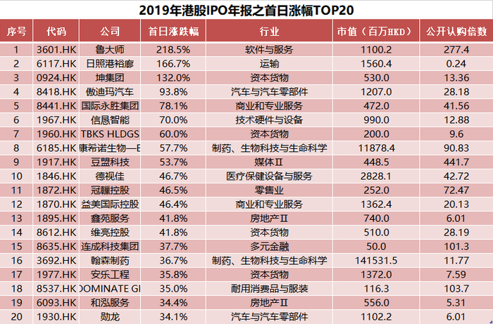 如果按照首日收盘涨幅来排序,那么在2019年新股中的涨幅之王当属软件股鲁大师了,首日收盘涨幅高达218%,一天翻两倍!