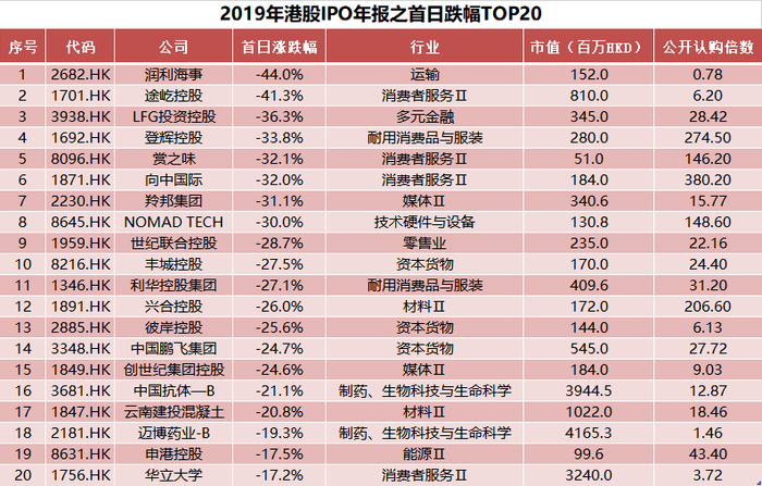虽然港股打新整体不跌破发行价的概率超过60%,但还是有一部分股票会成为打新投资者的心头之痛。在2019年港股新股上市首日跌幅榜中,润利海事以44%的跌幅荣膺这个最惨宝座。
