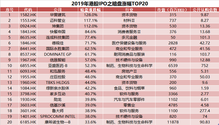 笔者统计了2019年华盛暗盘的数据,其中获得暗盘涨幅之王的是华营建筑,暗盘涨幅高达128%。这也意味着中签华营建筑的投资者在新股还未上市就可以率先兑现翻倍的收益。