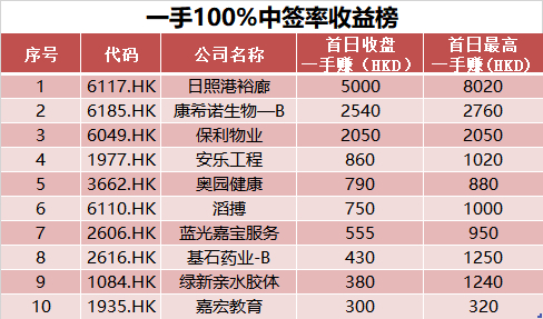 但是如果以全年来排序,最大收益的“普惠”肉签却并非保利物业。2019年6月上市的日照港裕廊以首日一手可赚5000港元,最大可赚超8000港元的收益排名年度第一。