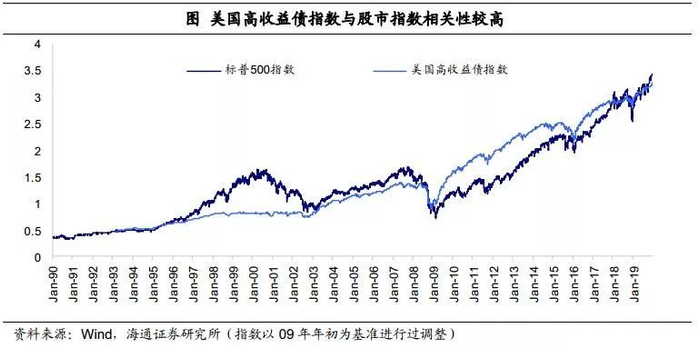美国高收益债指数与股市指数相关性较大,背后是企业基本面的逻辑。美国经验看,高收益债风险和收益介于股票和投资级公司债之间,而且比起基准利率,高收益债整体收益情况更多地取决于企业的基本面情况,高收益债与国债收益率相关系数非常低,反而与股市指数相关性较高,比如在2018年美联储加息周期中,由于当年美国经济数据向好、企业基本面改善,高收益债整体表现比公债和投资级债券都要亮眼。