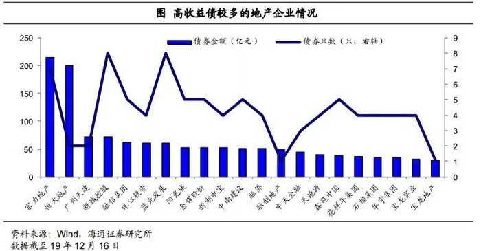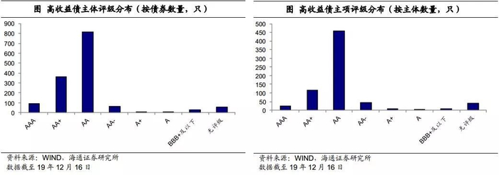 我国高收益债近两年有明显扩容。我们选取了截至19年12月16日的存量信用债,剔除当日无中债估值的个券后,通过匹配剩余期限计算出与同期限国开债的利差,其中有回售权的个券选择用行权剩余期限。同时考虑到临近到期债券估值容易出现大幅波动,我们剔除了剩余期限不足1年的个券,最终筛选出高出同期限国开债收益率400BP的信用债共1431只,涉及701家发债主体。