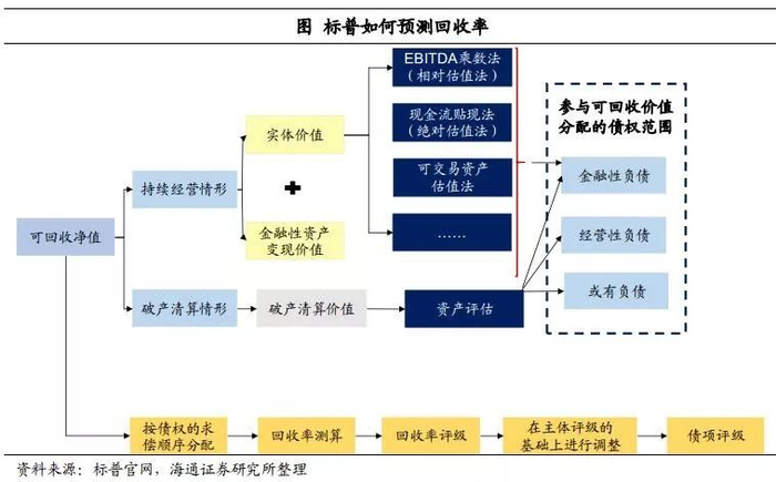 标普和惠誉的回收率评级按照债权的求偿顺序给出,由高到低分别为1+到6或RR1到RR6,穆迪侧重于给出违约损失率,按照LGD1-LGD6级别划分。具体来看,标普和惠誉的评级方法为:对假定违约情况下的企业进行估值,按照各类债权的求偿顺序一次进行分配,从而计算不同等级的债权人回收比例。而穆迪的为:对于B2以下评级的企业债券,回收率评级方法与标普和惠誉基本一致;对于B2-Ba1评级企业所发债券,不同债项的LGD由企业违约回收率的概率分布及假定违约时刻的负债结构所决定。标普和惠誉预测回收率的方式具体如下图所示: