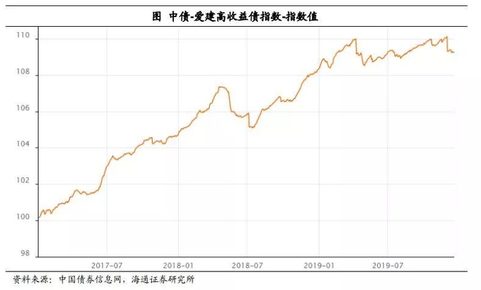 2018年9月中债推出“中债-爱建高收益债券指数”,成分券筛选标准就着重收益率的考量:债券到期收益率不低于8%或到期收益率不低于同代偿期中债企业债收益率曲线(AA-),此外还有余额和成交量的考量。该指数计算的是财富指标值。
