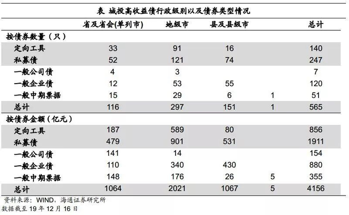但截至19年12月16日,城投高收益债数量增加至了565只,占样本量的比例达到40%,相应债券余额4156亿,金额占比达到了37%,是高收益债样本的重要组成部分。