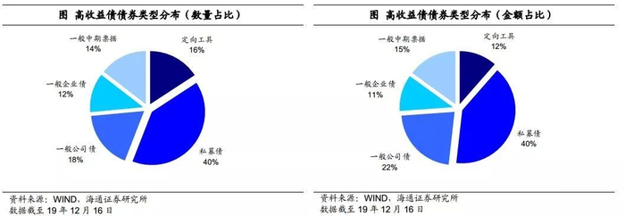 高收益债中私募为多,但公募债占比也不低。经过筛选得到的存量高收益债中,从数量占比看,私募公司债、定向工具分别占总量的40%和16%,合计占到56%;公开发行的债券占比达到44%,占比也不低,其中一般公司债较多,占到总量的18%。如果以金额占比看,高收益债中也有近一半的是公开发行的债券,占到48%。
