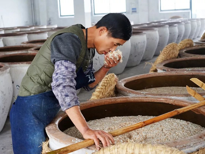 经历了浸米、蒸饭、落罐发酵等三十六道纯手工制作工序,灌装封坛,才只是刚刚开始。