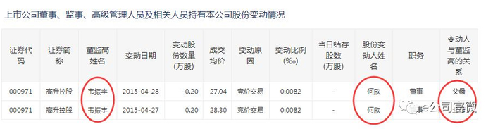 前文已提及,1980年出生的何欣为韦氏家族重要成员,其真实身份是韦俊康的妻子,韦振宇法律意义上的母亲。这一点,在深交所董监高及相关人员持有公司股份变动情况中得到验证。此前公告显示,2015年4月27日,何欣在高升控股(时名“蓝鼎控股”)披露收购高升科技方案后不久违规买入2000股,时任董事长韦振宇知悉情况后建议何欣立即停止买入并尽快处置所购入全部股票。4月28日,何欣亏损卖出。
