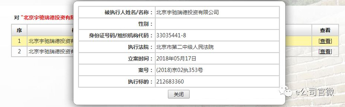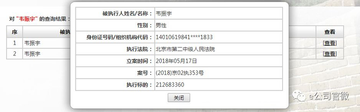 中国执行信息公开网显示,韦振宇为今年5月份立案的(2018)京02执319号、(2018)京02执353号的被执行人,执行标的分别为2.04亿元、2.13亿元。