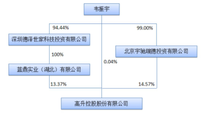 韦振宇通过宇驰瑞德和蓝鼎实业间接持有高升控股的股份,合计占股27.98%。天眼查信息显示,目前韦振宇实际控股公司高达42家,包括影视、酒店、地产等。