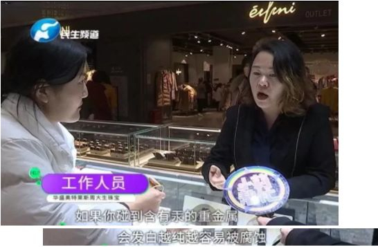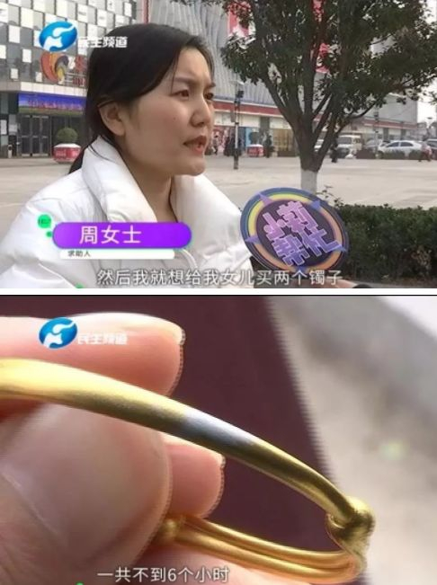前两天,郑州周女士求助记者,说她在华盛奥特莱斯周大生珠宝专柜,给她女儿买了两个金镯子!可是戴上不到6个小时!出现了“泛白银色”的现象...