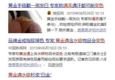 为什么白斑又消失了呢?结合现场工作人员的解释,小编在网上搜索到,黄金遇到汞,会发生一种叫“汞齐”的化学反应,形成一种白色新物质“金汞齐”附着在手镯上,感觉就像黄金褪了色一样。而在生活中温度计、劣质化妆品、生活用品中有可能会出现汞。