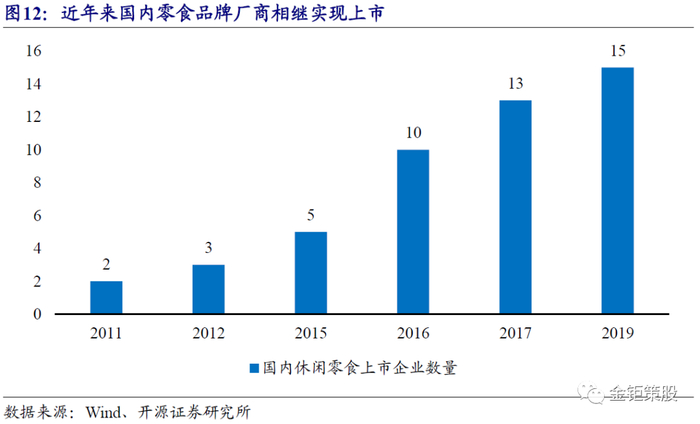 消费升级,国内休闲零食品牌商相继上市,品牌化集中在路上。消费升级的背景下,原本行业分散、无序竞争的休闲零食品类开始有国产品牌厂商崛起。如烘焙领域的长保品牌达利园、盼盼,中保品牌港荣、憨豆先生,短保品牌桃李;休闲卤制品领域的绝味、周黑鸭;坚果炒货领域的三只松鼠、洽洽、百草味;肉类零食领域的有友、棒棒娃;果脯蜜饯领域的溜溜果园;豆制品领域的奇爽、盐津铺子等等。国内厂商主导的休闲零食品类也正走在外资品牌主导西式零食的品牌化集中的道路上。并且我们可以看到近年来,国内的休闲零食品牌厂商纷纷实现了上市,其中最为老牌的是2011年上市的洽洽股份和好想你,2012年上市了煌上煌,2015年上市了桃李面包和达利食品,2016年来伊份、元祖股份、桂发祥、周黑鸭上市,好想你收购百草味,2017年盐津铺子、绝味食品、香飘飘上市,2019年三只松鼠和有友食品上市。随着国内休闲零食品牌商的相继上市,品牌知名度进一步提升,资本实力也进一步得到加强,未来我国休闲零食的品牌化集中将进一步加速。