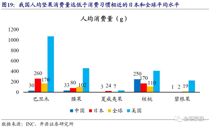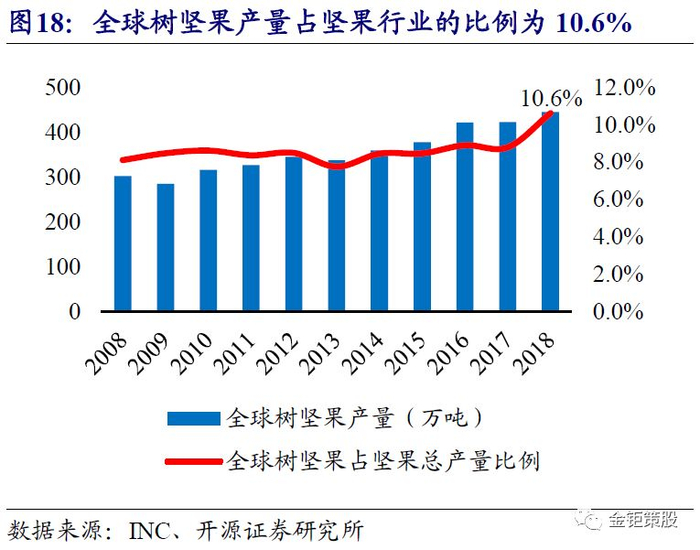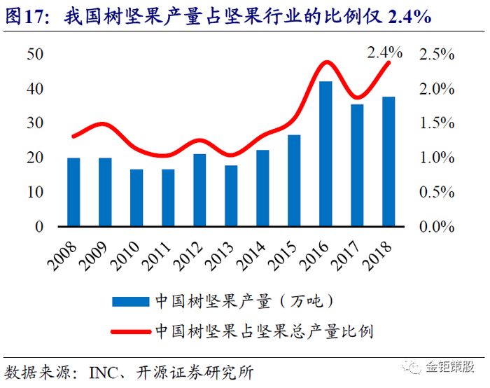 坚果消费由种子坚果向树坚果升级,核心坚果品类仍有增长潜力。树坚果由于种植环境的限制,原材料生产(价值量最大的环节)绝大部分在海外地区,而后续的加工工艺也相对简单和标准化。因此国内坚果消费由种子坚果向树坚果消费升级给零售端品牌的发展提供了非常好的机会。三只松鼠紧抓树坚果在电商领域发展的机会,成为了国内树坚果电商领域的龙头品牌。新鲜坚果富含多种营养物质,其中蛋白质、矿物质、维生素、膳食纤维及人体必需的不饱和脂肪酸、微量元素含量均位居前列,可以抗氧化、预防多种疾病,提高免疫力。尤其是近年来逐步流行起来的树坚果代表了休闲零食健康化的升级方向。中国食品工业协会数据,2018年我国坚果行业总产值已达1378亿元,近10年的CAGR为15.4%,而种子坚果向树坚果的消费升级正驱动着我国坚果行业保持持续稳健增长。公司作为树坚果电商领域的龙头,核心坚果品类在2017年即开始进入了低速增长阶段。不过考虑到我国树坚果的人均消费量还非常低,我国巴旦木、腰果、夏威夷果、碧根果的人均消费量分别为30g/年、33g/年、3g/年和1g/年,相较于消费习惯相近的日本和全球平均水平而言均存在翻倍以上的提升空间。同时我国树坚果的产销量较种子坚果的产销量还有非常大差异,2018年我国树坚果的产量为37.7万吨,消费量预计接近60万吨,但种子坚果的产量高达1548.6万吨。目前我国树坚果的产量占坚果行业整体的比例仅2.4%,较全球10.6%的比例还有非常大的提升空间,我国坚果消费升级的空间还很大。我们认为在国内种子坚果向树坚果消费升级的背景下,公司作为树坚果的龙头,未来坚果品类仍有增长潜力。尤其是在公司开拓出线下渠道之后,公司坚果品类有望重回稳健快速增长。
