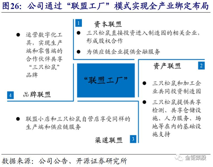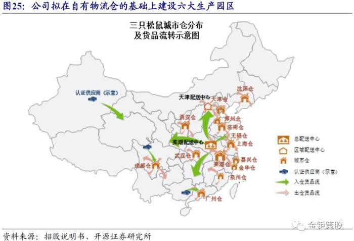 “联盟工厂”模式实现全产业链绑定布局,进一步提升产品研发和品质保障能力。公司在全国范围内除安徽芜湖的总配送中心外,还建立有8个自有的配送中心或城市仓,并与第三方仓配服务商合作建立了15个合作仓,实现了全国市场覆盖。同时公司拟在大的自有仓基础上与行业专业制造加工的合作伙伴打造制造园,将合作伙伴的加工生产线直接搬到物流仓,打造“联盟工厂”,实现生产、物流运输和销售的无缝对接。公司“联盟工厂”的模式是资本、资产、渠道和品牌四大维度全方位的联盟,从而实现和生产加工企业的密切绑定和合作,保障产品品质管控和新产品的研发能力。资本合作是指公司将通过投资进入制造园的企业,形成股权上的合作,同时给供应链上的企业提供便捷的金融服务。资产合作是指制造园由公司和加工企业共同投资,公司提供共享检测、共享仓储设施、人力服务、场地等在内的基础设施支持。渠道合作是指对于终端的联盟小店可以和公司自营店享受同样的生产端和供应链服务。品牌合作则是指运营数字化工具,实现生产端和零售端合作伙伴共享“三只松鼠”品牌。“联盟工厂”模式使得公司原有的生态圈合作变得更加紧密,并且实现了公司向上游生产端的延伸,完成了从产品研发、生产、运输、销售的全产业链布局。全产业链布局不仅可以提升公司新品的研发能力和产品品质的管控能力,增强长期竞争力,还可以进一步提高供应链效率,提升公司的利润率。此前,公司产品从生产工厂到华东的总配送中心,再到全国各个仓,需要两段物流、三次质检。而在“联盟工厂”模式下,直接实现从制造园中心配送到终端,只有一段物流、两次质检。未来公司将在全国范围内建立六大物流园区,对应六大生产园区,覆盖全国,减少物流配送距离,同时快速对终端需求做出反馈。未来随着全产业链布局、供应链效率的提升以及龙头规模化优势,公司的利润率将进一步提升。