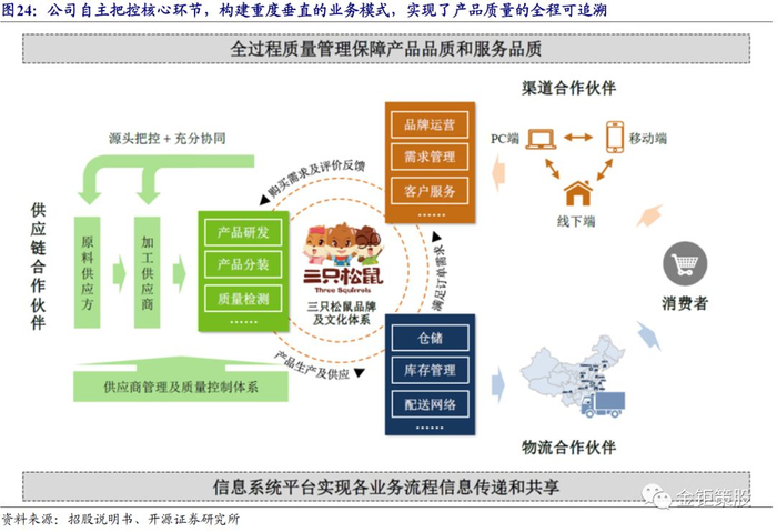 坚持核心环节自主控制,保障产品品质、提升消费者信赖。在休闲零食品牌化集中的过程中,品牌意味着产品品质和产品质量安全的保障,品牌商最终的竞争体现的是产品端的竞争。公司作为零售端的品牌商,在产品生产端有天然的劣势,但公司通过对核心环节的自主控制,构建了重度垂直的业务模式,通过供应商准入、入库严格质检、仓储库存自主管理等措施实现了对产品质量的把控。同时,公司基于信息技术手段,借助云质量信息化平台对产业链各环节进行有效控制,实现质量全程可追溯。新产品研发和产品品质保障方面,公司则设立食品安全及研发研究院加大研发投入、设立专业食品检测子公司保障产品品质和质量。同时公司和上游原材料供应商、加工厂商、产品研发机构、下游仓储物流服务商等密切合作、相互支持,发挥各方比较优势,共同建立互联网新农业生态圈,实现合作共赢。