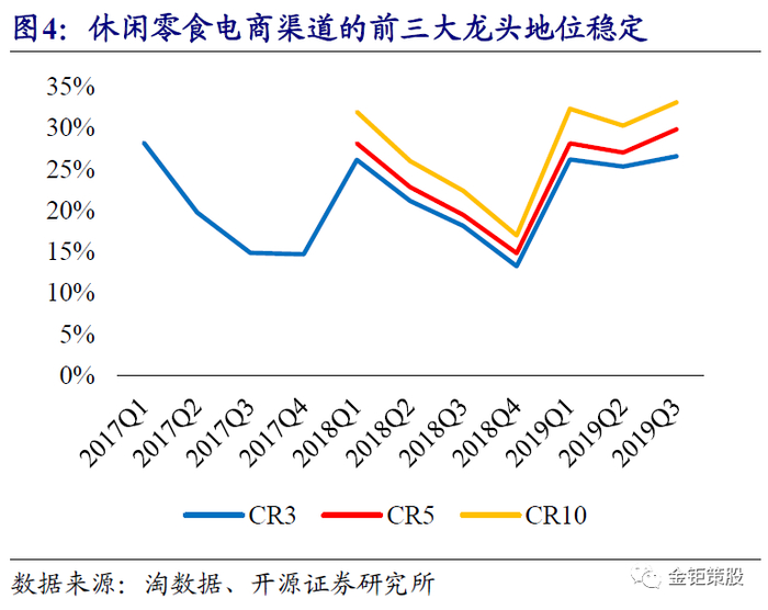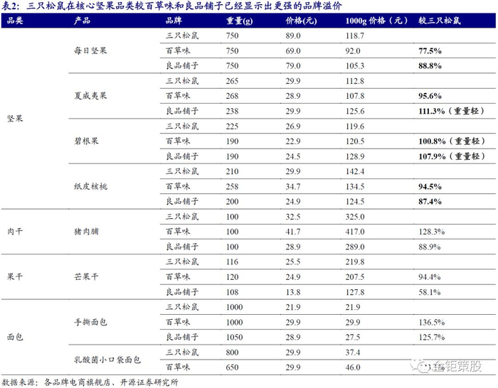 电商渠道强者恒强,全国化的品牌优势显现。电商渠道讲究产品的性价比,竞争核心在于打造爆品。由于休闲零食保质期和运费的存在,客单价高、保质期长的产品更适合电商渠道打造爆款单品。休闲零食的电商品牌均选择以高单价可囤货的坚果品类为核心,其次是烘焙、肉脯、果干以及零食组合装等高单价的产品,产品趋同性强。同时电商渠道的标准化程度高,主要的平台均为天猫、淘宝、京东等,主要促销手段均是折扣和满减等。产品的趋同性、渠道和营销手段相对标准化,龙头的品牌、流量转化优势显著,马太效应强者恒强。目前休闲零食电商渠道的前三大龙头三只松鼠、百草味、良品铺子的地位已经相对稳固,后续品牌的市场份额极低。休闲零食行业电商渠道的CR3在2019Q3达到了26.54%,而CR5和CR10仅为29.8%和33.1%。其中三只松鼠作为龙头,市占率持续超过10%且在2019年行业进入稳定中速发展之后市占率持续提升,逐步拉开了与第二、第三名的差距。同时,从核心品类坚果来看,三只松鼠较百草味、良品铺子已经实现了更高的品牌溢价,在同品类、同规格的产品价格上显著高于其余二者。并且,不同于线下休闲零食品牌商的区域性品牌影响力,电商渠道形成的是全国化的品牌影响力,目前三只松鼠已经形成了全国化的品牌影响力。