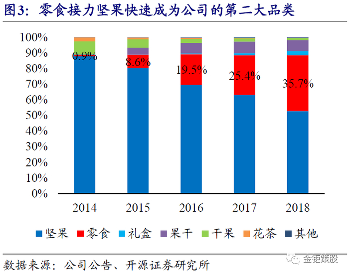 把握树坚果电商渠道发展红利,7年实现A股上市,成就休闲零食龙头。公司以在电商渠道销售树坚果起家,成立首年“双11”即实现销售766万,位列食品电商销售的第一名。抓住了坚果炒货由传统种子坚果向树坚果消费升级的趋势以及休闲零食电商渠道快速发展的红利,公司2013-2016年收入都保持翻倍以上的快速增长。2013年公司全网收入即达3.26亿元,2014年双11单日销售破亿,2015年双11单日销售达2.66亿元,2016年双11单日销售5.08亿元。2016年开始公司开设了第一家线下体验店,并且发力坚果之外的零食品类,当年零食品类即实现收入8.64亿元。2017-2018年公司零食品类延续高增长,快速成长为公司的第二大品类,截止目前坚果的收入占比已经下降到了50%以下。2019年公司成功实现上市,仅用7年时间完成了上市同时成为了休闲零食行业的龙头。