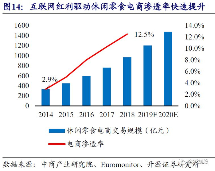 互联网红利驱动休闲零食电商渠道渗透率快速提升,零售品牌商崛起。2007年以来,随着我国互联网普及率的不断提升,网购交易规模持续快速增长,从2007年的520亿元快速增长到2018年的9.4万亿元。互联网红利驱动了我国休闲零食在电商渠道渗透率的快速提升。据中商产业研究院和Euromonitor的统计数据,我国休闲零食电商渠道的交易规模从2014年的330亿元快速增长到2018年的969亿元,电商渠道的渗透率由2014年的2.9%快速提升到了2018年的12.5%。电商渠道的快速发展也孕育出了如三只松鼠、百草味等零售端的品牌。不同于海外休闲零食市场以产品品牌为主,国内休闲零食市场的品牌商分为产品品牌和零售品牌两类。产品品牌如洽洽、达利园、桃李、绝味、周黑鸭、盐津铺子等等,零售品牌则均是近年来快速崛起的如三只松鼠、百草味、来伊份、良品铺子等。产品品牌的优势在于品牌即可以直接联想到具体的产品,代表着产品品质的保障,但劣势在于品牌商进行产品品类拓展(尤其是大品类的拓展)的难度大,品牌影响力进行转嫁的难度大。零售端品牌的劣势在于无法和产品产生直接的联系,且一般都是多品类的品牌,优势在于扩品类相对容易。