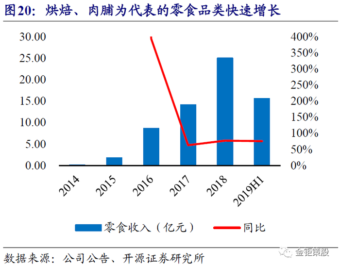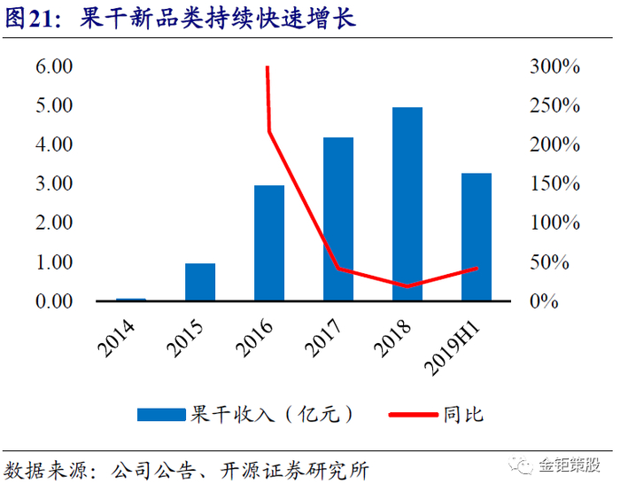 烘焙、肉脯、果干等新品类快速增长,全品类战略持续推进。核心坚果品类实现引流之后,公司在2016年开始发力坚果以外的新品类,以烘焙、肉脯为核心的零食品类以及果干等核心新品类在2016年开始快速增长。零食品类贡献收入从2015年的1.75亿元快速增长到了2018年的25亿元,CAGR达到了143%。果干贡献的收入也从2015年的0.93亿元增长到了2018年的4.93亿元,CAGR达74%。2019年上半年来看,零食品类继续保持着76%的高速增速,果干品类也保持着42%的快速增长。烘焙作为休闲零食最大的子品类,整体行业规模超过2300亿,且保持着10%左右的行业增速。果干,通过真空冷冻干燥技术将新鲜水果脱水干燥得来,保留了新鲜水果全部的营养物质,同时又不破坏水果原有的结构和形状,是新兴的健康休闲零食品种。果干目前在各大电商平台都处于快速增长的阶段,其中百草味果干系列收入从2016年的1.2亿元快速增长到2018年的5.98亿元,良品铺子果干果脯收入同样从2015年的4.74亿元快速增长到2017年的7.56亿元。烘焙、肉脯、果干等新品类的成功拓展,意味着公司品牌在多品类转嫁上的成功,同时公司还在持续推出了干果、膨化(饼干、薯条、锅巴等)、卤味、豆干素食、花茶等众多新品类,全品类战略持续推进。全品类的拓展不仅驱动公司收入继续保持快速增长,同时也打开了公司收入的增长瓶颈。