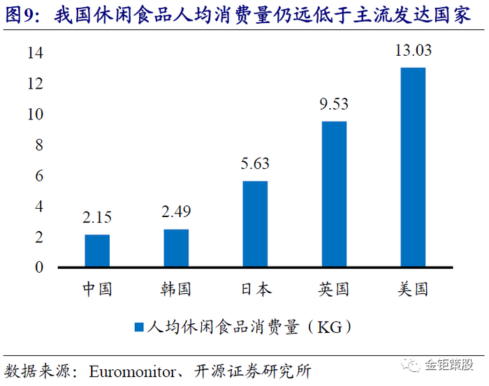 休闲零食规模万亿,量价齐升驱动行业持续增长。据中商产业研究院推算,休闲零食市场包含一切“少量方便包装食品”,市场规模在2017年已超9000亿,增速保持在11-12%左右,预计目前市场规模已超万亿。据中国食品工业协会《中国休闲食品行业发展研究报告》,我国休闲食品行业年产值从2005年的2552亿元增长到了2014年的10620亿元,年复合增速17.17%,预计到2020年行业市场规模将接近2万亿元。据Frost & Sullivan的统计数据,2018年我国休闲食品行业市场规模为10297亿元,2012-2018年的CAGR为12.26%。多方统计口径均表明我国休闲零食行业规模已超万亿。虽然我国休闲零食销量巨大,但人均消费仍远低于主流发达国家,仍有较大的成长空间。据Euromonitor统计数据,2015年我国休闲零食人均消费量为2.15KG,韩国和日本分别为2.49KG与5.63KG,英国、美国则分别为9.53KG与13.03KG。我国人均休闲零食的消费量与韩国接近,但较日本还有翻倍以上的提升空间,较英国和美国则分别还有3-5倍的成长空间。同时在消费升级的背景下,消费者对于休闲零食的要求也越来越高,我国休闲食品正逐步向健康化、高端化升级,休闲零食行业整体价格也随之稳步提升。量价齐升,我们认为中国休闲零食行业仍将继续保持稳健较快增长。