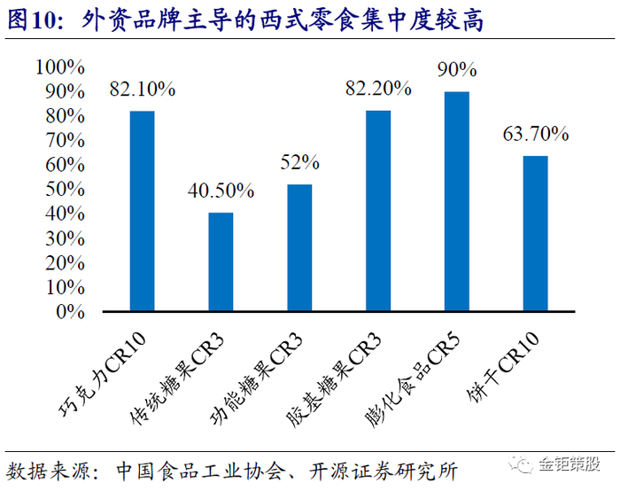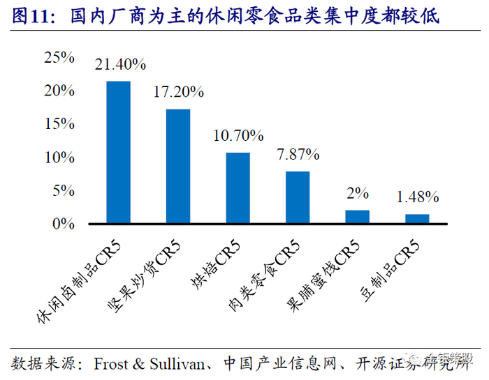 品种众多、进入门槛低,行业整体分散,其中标准化程度较高的西式零食品类被外资垄断相对集中,其他国内厂商主导的品类集中度都较低。我国地域辽阔,各地域由于气候、饮食习惯、消化等方面的差异,形成了不同的口味偏好,如“南甜北咸”、“东辣西酸”等。口味偏好的差异、食材的多样化、西式零食的进入,以及休闲零食本身满足人类需求和消费场景的多样化,造就了休闲零食行业品类和品种的多样化。休闲零食品类来看,可以分为糖果和巧克力、烘焙、坚果炒货、休闲卤制品等大品类以及其他如休闲豆制品、肉干肉脯、果脯蜜饯等小品类。产品种类而言,国内华中地区龙头良品铺子的产品组合已经超过了1000种,华东地区龙头来伊份的SKU超过了800个,即使产品品类相对较少的线上龙头三只松鼠的产品组合也超过了500款。我国的休闲零食,尤其是本土化的传统零食,生产工艺大多来自传统的手工制作,行业进入门槛低。同时很多零食产品没有统一的工艺标准和国家标准,产品品质和口味差异较大,标准化程度较低。品种众多、标准化程度较低,叠加行业门槛低,带来了整体行业竞争格局的分散。分品类来看,标准化程度较高的西式零食,如糖果、巧克力、薯片和饼干等,由外资品牌主导,市场集中度较高。巧克力市场上,2016年我国巧克力销售额的CR10为82.1%,其中前两名玛氏(旗下主要品牌为德芙)和费列罗分别占比39.8%和17.8%。糖果市场中传统糖果阿尔卑斯、雅客和大白兔占据市场份额分别为的15%、13%和12.5%,CR3为40.5%;功能性糖果雅客、荷氏和金嗓分别占22.5%、18.3%和11.2%,CR3为52%;胶基糖果中绿箭、益达和乐天分别占49.9%、22.6%和9.7%,CR3达到了82.2%。膨化食品市场上(主要为薯片),乐事、上好佳、好丽友、品客、可比克、艾比利等品牌占据了零售渠道90%以上的市场份额,其中,乐事以超过25%的市场份额稳居第一。饼干市场上,CR10为63.7%,其中前两名分别为亿滋中国和徐福记,分别占据14.4%和8.9%的市场份额。而对于标准化程度相对较低的烘焙类、本土化的休闲卤制品、坚果炒货以及规模较小的小品类休闲零食而言,国内厂商占据主导,市场分散。2018年我国烘焙食品市场CR5为11.1%,其中达利食品、桃李面包和好丽友市场份额为前三,分别占比4%、3.2%和1.7%。休闲卤制品的CR5为21%,前五名分别为绝味、周黑鸭、紫燕、煌上煌和久久丫,市占率分别为8.9%、5.5%、2.7%、2.6%和1.3%。坚果炒货的CR5为17.2%,前五名分别为洽洽、三只松鼠、百草味、良品铺子和来伊份。小品类休闲零食的市场集中度则更低,果脯蜜饯前五大品牌分别为溜溜果园、怡达、御食园、佳宝和华味亨,CR5仅2.08%;肉类零食的前五大品牌为有友、五洲、棒棒娃、母亲、品品,CR5为7.87%;豆制品的前五大品牌为奇爽、盐津铺子、口口香、华鹏、吴府记,CR5为1.48%。
