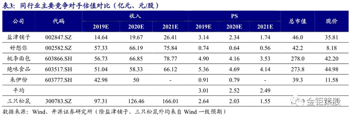 国内休闲零食电商龙头,首次覆盖给予“买入”评级。公司是国内休闲零食的电商龙头,借助休闲零食在电商渠道快速渗透的红利打造出了全国化、多品类的品牌影响力。目前公司正在借助全国化的品牌影响力和供应链能力由线上渠道向核心的线下渠道拓展,同时通过“联盟工厂”模式向上游延伸,实现全产业链布局。公司线下渠道的拓展将打开渠道扩张的空间,同时也将打破公司品类拓展的限制,推动公司进入渠道扩张和产品拓展双轮驱动的发展快车道。未来随着公司线下渠道的成功拓展,公司将成为唯一一家实现全国化、全品类、全渠道的休闲零食综合平台,有望成长为行业真正的龙头。我们预计2019-2021年的收入为97.3/126.5/166.0亿元,当前股价对应2019-2021年PS为2.64/2.03/1.55倍,首次覆盖给予“买入”评级。