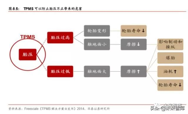 功能上,TPMS 可以提高行车安全舒适性与燃油经济性。一方面,不正常的胎压会影响汽 车制动效果、导致爆胎甚至引发交通事故。另一方面,不正常的胎压会减少轮胎寿命、加 剧悬架磨损并增加油耗。TPMS 的存在可以辅助车主保持胎压在合理范围内,保障行车安 全、降低后期保养费用、提高燃油经济性。