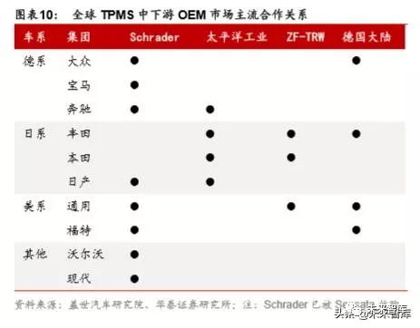 英飞凌、飞思卡尔等海外巨头瓜分全球市场。TPMS 芯片的物料包括各类传感器、MCU, 能提供 MCU 和传感器的厂家很多,但能提供 TPMS 芯片整体解决方案提供者并不多,主 要厂商包括海外电子巨头英飞凌、飞思卡尔、GE 以及 Melexis;TPMS 集成商主要包括:Schrader、太平洋工业以及 ZT-TRW,主要向英飞凌、飞思卡尔、GE 采购 TPMS 芯片。