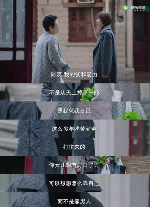 《我的前半生》中,唐晶在遭遇爱人和最好的闺蜜的联合背叛时,她不挽回、不原谅、不纠缠;面对薛甄珠提出的成全贺涵和罗子君的说辞时,她冷静地反驳,“阿姨,我的钱和能力,不是从天上掉下来的,是我凭我自己,这么多年吃苦耐劳打拼来的,你女儿想有好日子过,可以想想怎么靠自己,而不是靠男人。”这也是“精英感”。这是一个独立、强大、自主的精英女性,在面对人生崩塌时迅速的重建能力。