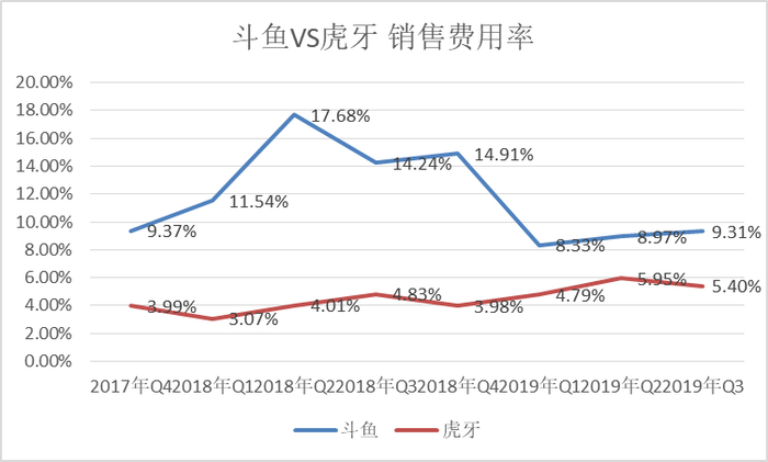 斗鱼就没有媲美虎牙的精细化运营策略,仍处在早期激进的扩张模式中。这点从两者的销售费用率对比可以看出。自2017年Q4以来,斗鱼的销售费用率一直高于虎牙。