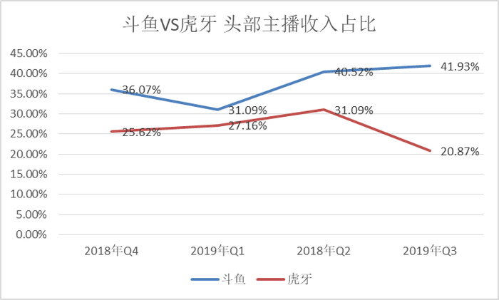 这句话也揭露了斗鱼的核心竞争策略——高度依赖头部主播。财报也佐证了这一策略,2018年Q4—2019年Q3四个季度,斗鱼头部主播(TOP100主播)的收入占比从36%上到了41%的高位,虎牙则是从25%降低到20%。