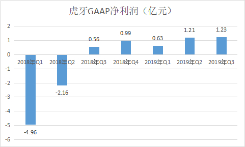 规模较小的虎牙在盈利方面却表现出色,虎牙早在2018年游戏直播全行业都处在亏损的阶段就实现了盈利。美国标准会计准则下,虎牙自2018年Q3到2019年Q3已经连续五个季度实现了正向净利润。