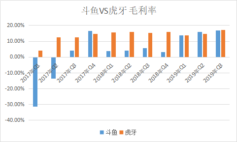一方面,斗鱼头部主播签约费用和薪资高昂,导致公司的内容成本居高不下。数据显示,斗鱼的收入分成占比一直处在高位,2016年为67.7%,2019年Q3上升到83%。成本的上升自然也压缩了公司毛利润。数据显示,在2017年以来的11个季度中,斗鱼的毛利率只有3个季度超过虎牙,其余均不如虎牙。