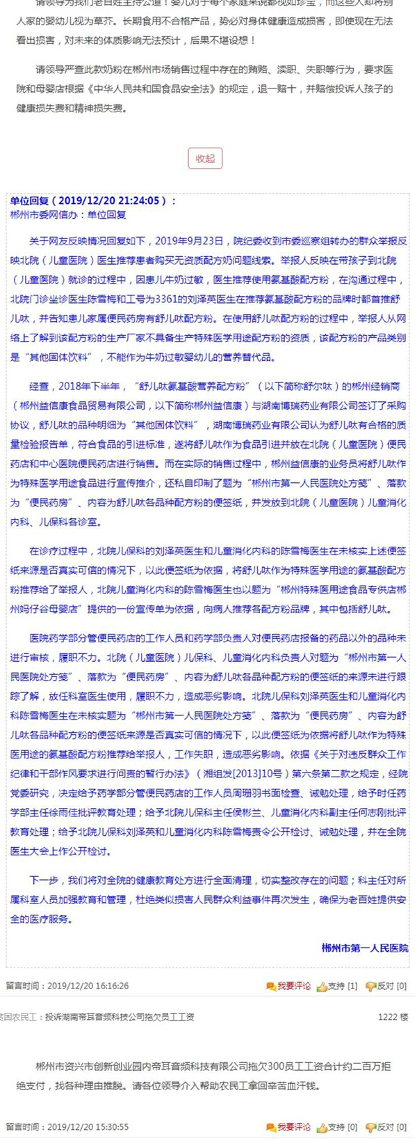 郴州市第一人民医院回复。