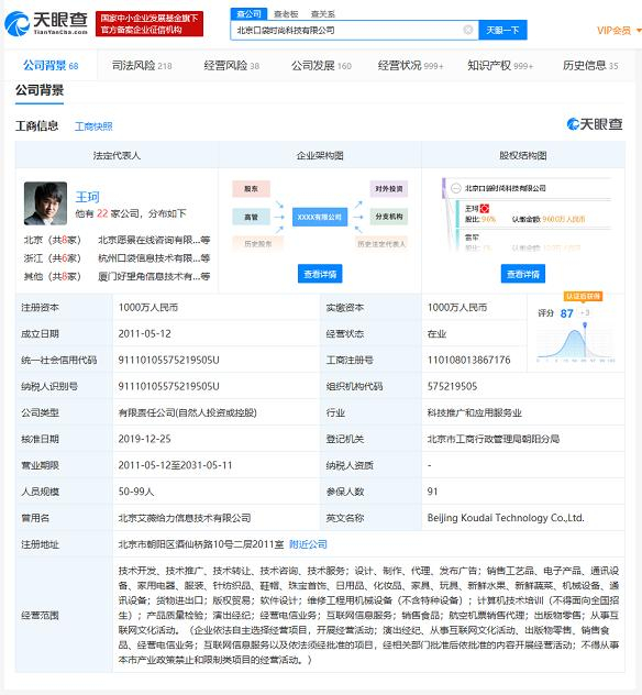 北京口袋时尚科技有限公司成立于2011年5月,注册资本为1000万人民币,法定代表人为董事长王珂,经营范围包括销售电子产品、家用电器、服装等。