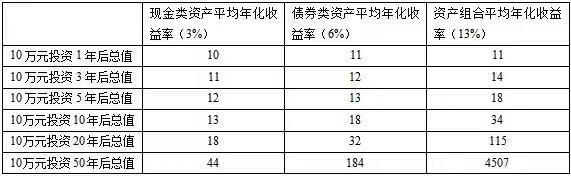 可以发现,同样用10万元本金投资不同类别的资产或资产组合,随着时间的推移,平均年化收益率13%的资产组合投资10年后的总值约为34万元,50年后总值约为4507万元。值得注意的是,该资产组合50年后的总值是投资货币类和债券类资产总值的24—102倍,显著拉开了财富等级。