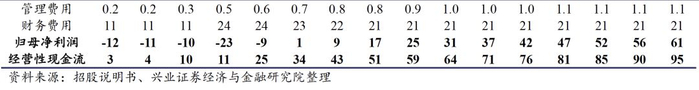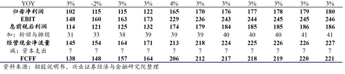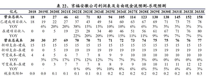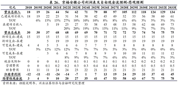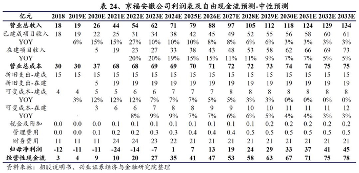 根据《京沪高速铁路首次公开发行招股意向书》披露,预测京福安徽公司2020-2024年净利润分别为-11.9亿元、-1.8亿元、7.3亿元、17.5亿元、24.3亿元。根据我们的测算,若收购后京福安徽公司对有息债务进行还款以降低两条在建铁路转固后的财务费用,方能实现上述预测利润。