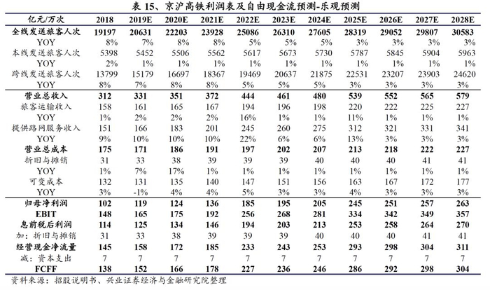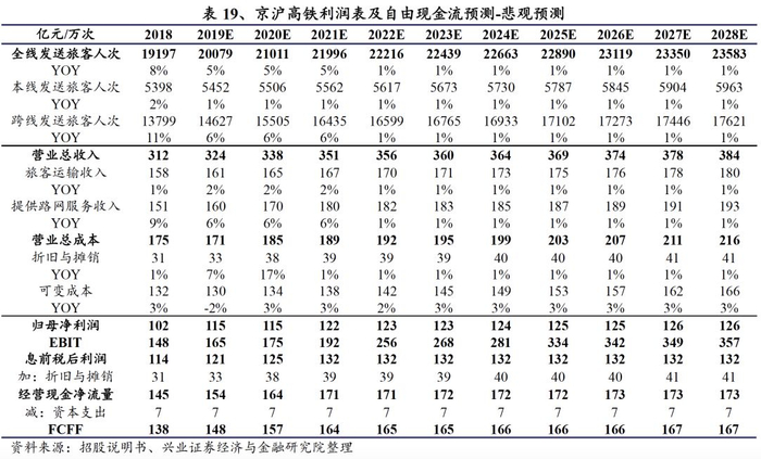 根据市场环境和历史数据,基于DCF估值模型,我们分别对京沪高铁在乐观、中性、悲观的假设条件下进行了利润和股权价值预测。