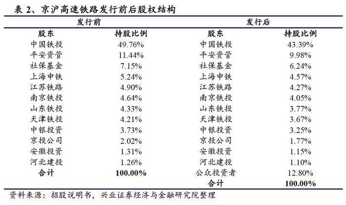 12月20日,证监会核准了京沪高铁的首发申请。12月25日,京沪高铁发布首次公开发行股票招股意向书等材料,将于2020年1月6日网上网下同时申购。京沪高铁本次A股发行前总股本为4,282,085.4611万股,本次发行比例不超过12.8%,即不超过628,563万股。发行前控股股东为中国铁投,持股比例49.76%。其他持股排名前五的股东有,平安资管11.44%,社保基金7.15%,上海申铁5.24%,江苏铁路4.90%。预计此次新增发行12.8%股本后,中国铁投持股比例将变为43.39%,平安资管9.98%,社保基金6.24%,上海申铁4.57%,江苏铁路4.27%。