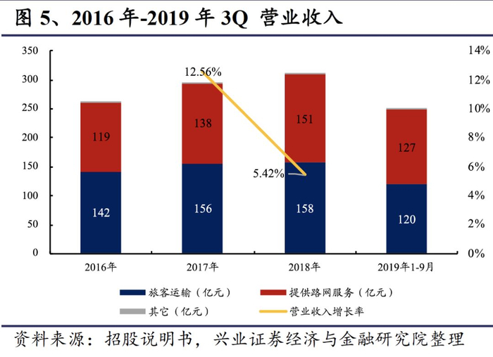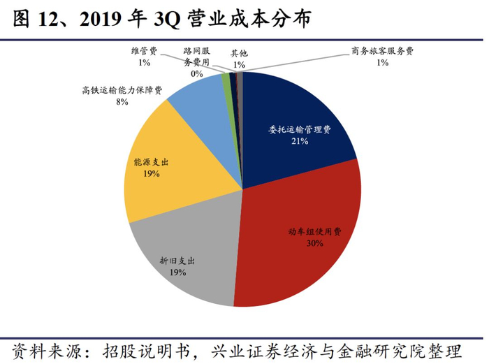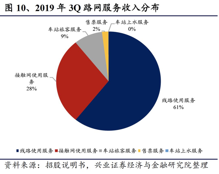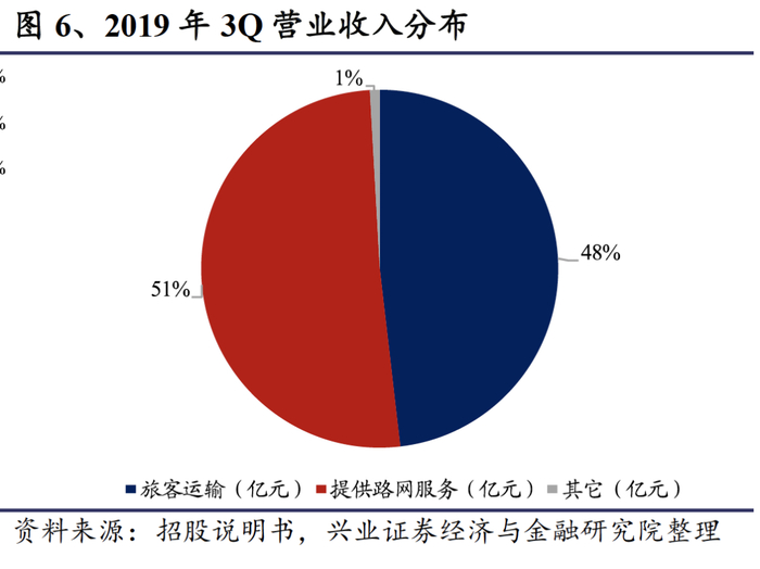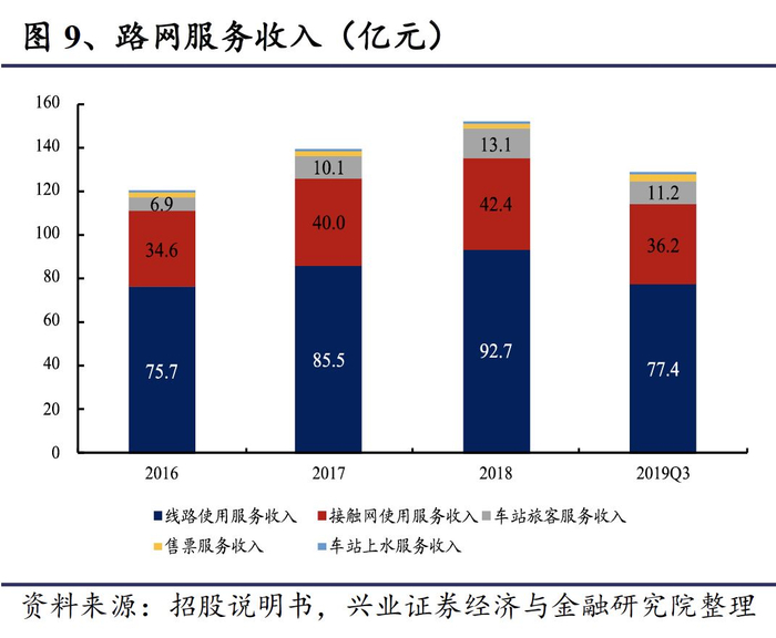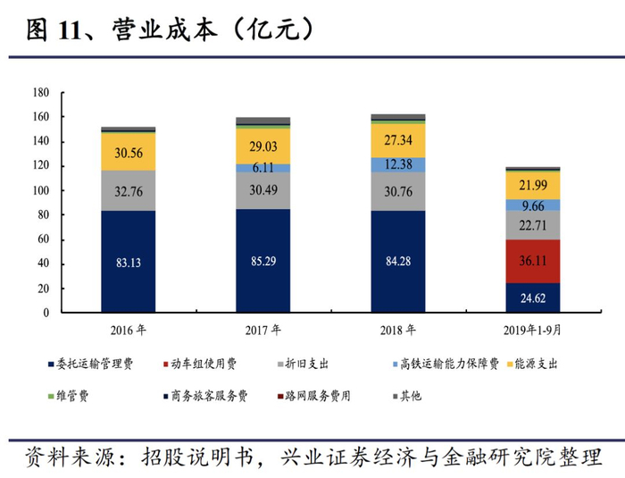 跨线路网服务收入大幅增长,是总营业收入增长的主要原因。跨线路网服务收入主要为对跨线列车提供服务而取得的收入,主要包括线路使用服务收入和接触网使用服务收入等。路网服务收入从2016年的119亿元上升到2018年的151亿元,2016-2018年复合增速为12.58%。截止2019年前三季度,路网服务收入首次超过了本线的旅客运输服务收入,占营业总收入的51%。