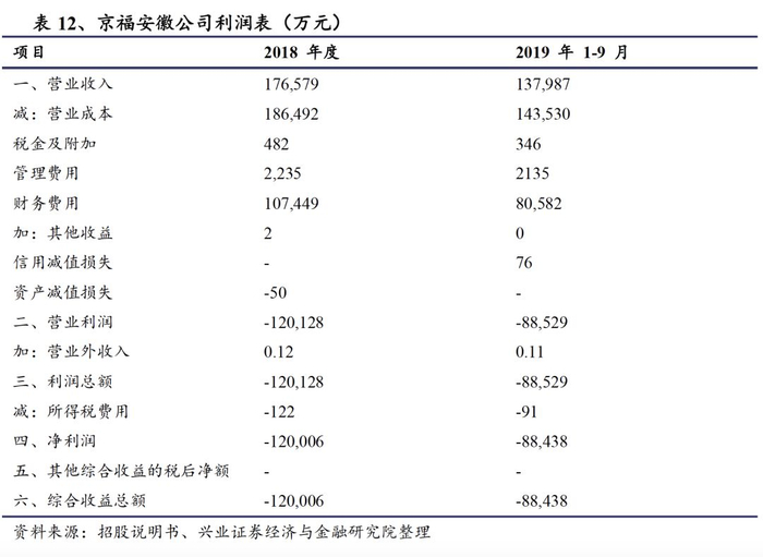 京福安徽尚处亏损,在建铁路通车后预计亏损将进一步扩大。2018年度京福安徽公司营业收入为17.66亿元,营业成本为18.65亿元,2019年前三季度营业收入为13.80亿元,营业成本为14.35亿元。京福安徽公司最近一年一期的净利润分别为-12.00亿元、-8.84亿元,尚处于亏损状态。主要是由于正在运营的合蚌客专和合福铁路安徽段开通时间尚短,商合杭铁路和郑阜铁路仍在建设中,京福安徽铁路公司仍然处于市场培育期。预计在商合杭铁路与郑阜铁路刚通车的两年内,净亏损将进一步扩大。