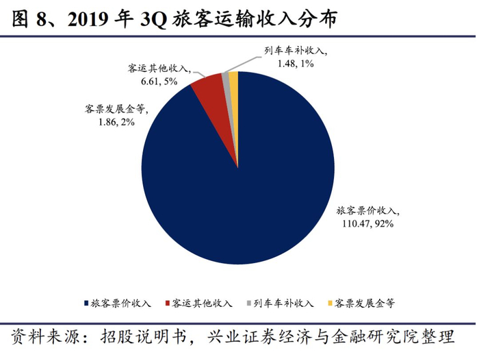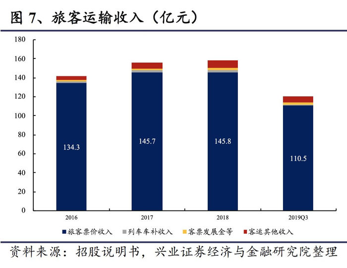 旅客运输收入小幅增长。旅客运输服务为本线的运输收入,2017年、2018年分别为138亿元、151亿元,同比增速9.71%、1.43%,由于近3年票价固定且开行列车数量稳定,因此收入紧随客座率的增长而小幅增长。从收入结构上看,主要为本线旅客票价收入,占比92%,客运其他收入占比5%,客票发展金占比2%,列车车补收入占比1%。