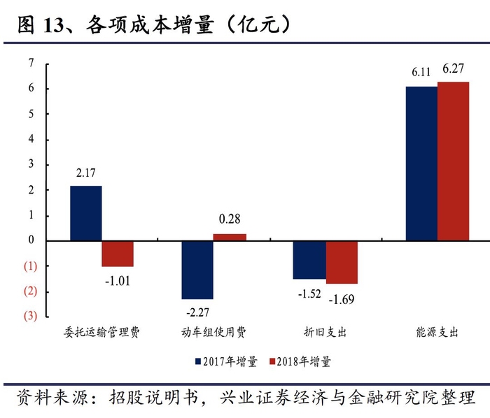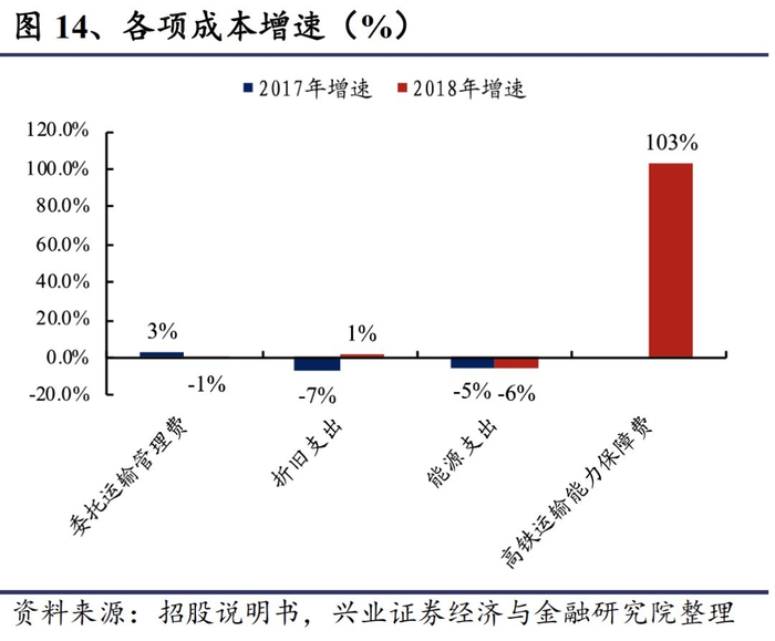 新增高铁运输能力保障费,为营业成本上升的主要原因。2018年,委托运输管理费同比减少1.01亿元,折旧费用同比增长0.28亿元,能源支出同比减少1.69亿元,均变化不大;而从2017年7月起,新增向路局支付高铁运输能力保障费(2018年为12.4亿元),是营业成本小幅上升的主要原因。