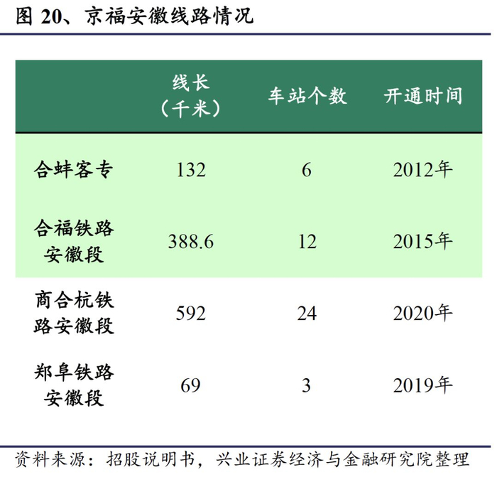     此次IPO预计发行不超过62.8亿股,募集资金拟用于收购京福安徽公司65%的股权,收购对价为500亿元,增值率15%。目前京福安徽公司有合蚌客专和合福铁路安徽段两条已建成的线路,营业里程分别为132公里、388.6公里。商合杭铁路安徽段和郑阜铁路安徽段分别预计2020、2019年建成投产,营业里程分别为592公里、69公里。2018年京福安徽公司亏损12亿元,预计在建项目通车后将亏损进一步扩大。