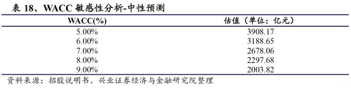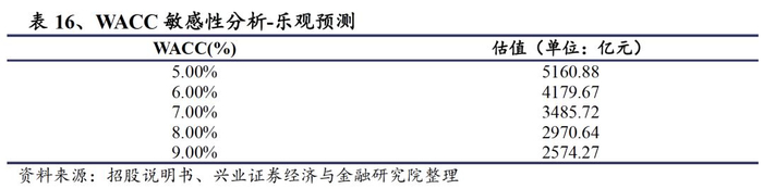 乐观情况下,2019-2023年预计公司归母净利润分别为119亿元、124亿元、136亿元、185亿元、195亿元。在资金成本为5%、6%、7%、8%、9%时,公司估值分别为5161亿元、4180亿元、3486亿元、2971亿元、2574亿元。