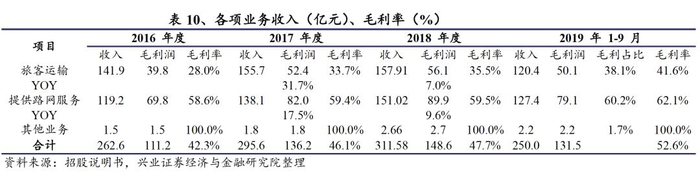 旅客运输、路网服务是公司利润主要来源,2019年Q1-3毛利润占比分别为38%、60%。旅客运输方面,2016-2018年,分别实现毛利润40亿元、52亿元、56亿元,17-18年同比增速分别为31.75%、6.97%,毛利率分别为28.04%、33.67%、41.63%。2016-2018年,旅客运输收入随客座率的提高而增长,而旅客运输成本总体稳定变动较小,因此旅客运输的毛利率呈增长趋势。路网服务方面,2016-2018年,分别实现毛利润70亿元、82亿元、90亿元,17-18年同比增速分别为17.49%、9.55%,毛利率分别为58.60%、59.39%、59.51%。由于路网服务收入随跨线列车数量增长而有较大幅度提高,且收入增幅高于成本增幅,路网服务毛利率呈现小幅上升态势。
